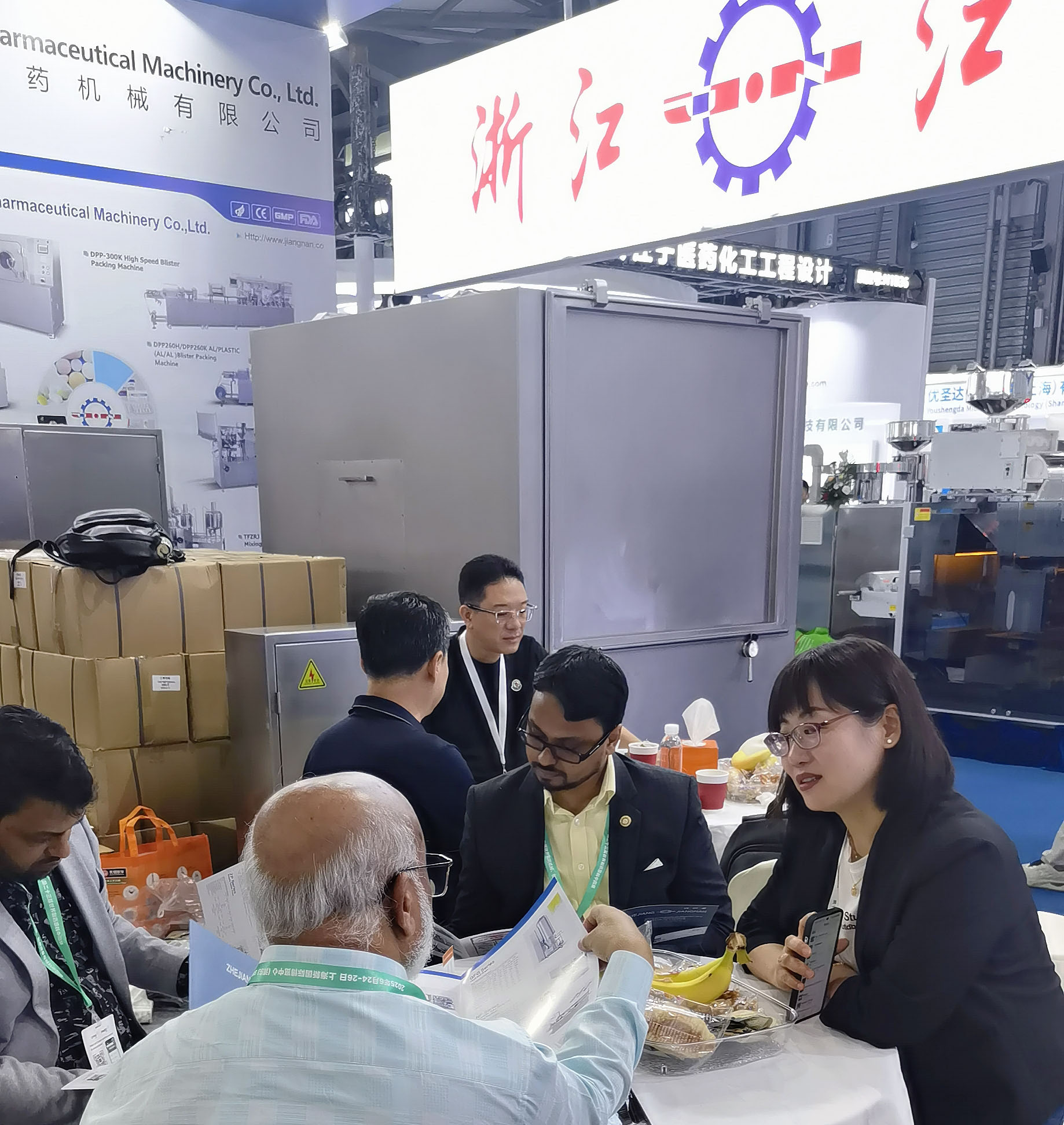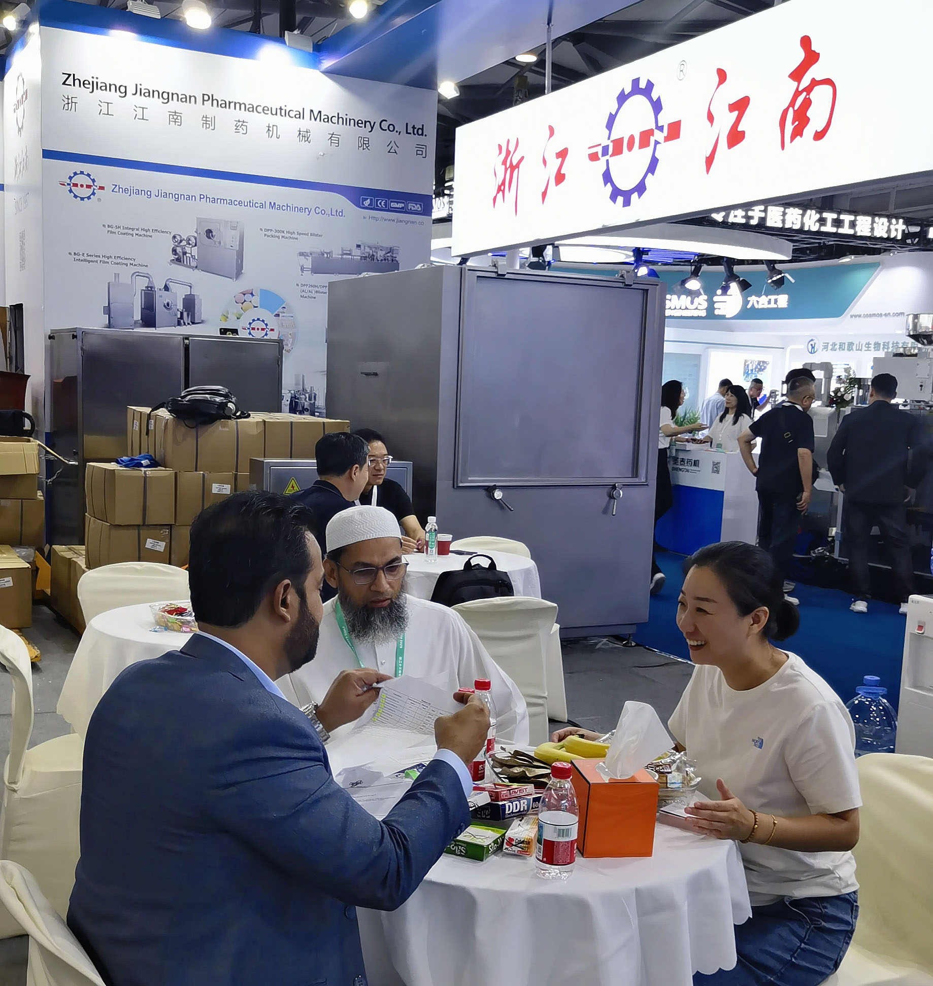 在這場科技盛宴中,浙江江南制藥機械有限公司攜明星產品陣容亮相本次展會。DPH380 高速泡罩包裝裝盒聯線采用全伺服驅動技術,實現每分鐘近500板的泡罩包裝,配合機器人自動上料裝置,可為藥企提供高效包裝的需求。軟膠囊生產線通過模塊化設計實現多規格柔性生產,而高效智能包衣機憑借精準控溫和節能環保特性,吸引眾多海外客戶駐足咨詢。現場專業買家對浙江江南的產品技術優勢給予高度認可,部分企業已達成初步合作意向。
