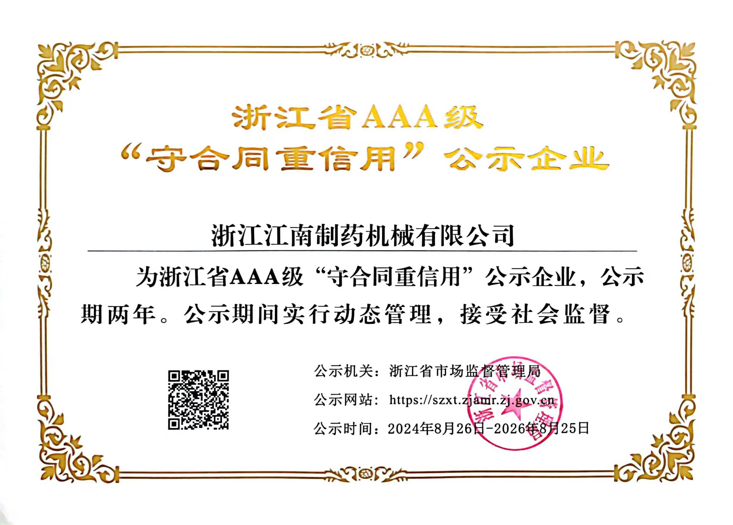 在此次發(fā)布的名單中,浙江江南制藥機械有限公司榜上有名,入選2024 年浙江省 AAA 級守合同重信用企業(yè)名單。